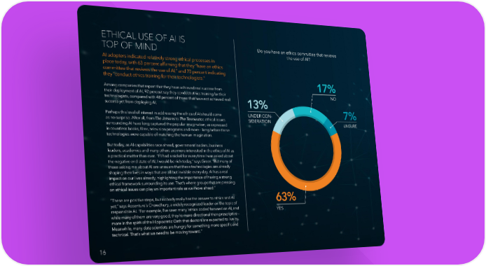 ETHICAL USE OF AI IS TOP OF MIND Do you have an ethics committee that reviews the use of AI? AI adopters indicated relatively strong ethical processes in place today, with 63 percent affirming that they “have an ethics committee that reviews the use of AI,” and 70 percent indicating they “conduct ethics training for their technologists.” 17% Among companies that report that they have achieved real success from their deployment of AI, 92 percent say they conduct ethics training for their NO technologists, compared with 48 percent of those that have not achieved real success yet from deploying AI. 13% Perhaps this level of interest in addressing the ethics of AI should come UNDER CON- 7% as no surprise. After all, from The Jetsons to The Terminator, ethical issues SIDERATION UNSURE surrounding AI have long captured the popular imagination, as expressed in countless books, films, television programs and more – long before these technologies were capable of matching the human imagination. But today, as AI capabilities race ahead, government leaders, business leaders, academics and many others are more interested in the ethics of AI as a practical matter than ever. “If I had a nickel for every time I was asked about the negative end state of AI, I would be rich today,” says Greer. “But many of those asking me about AI are unaware that these technologies are already shaping their lives in ways that are all but invisible every day. AI has a real impact on our lives already, highlighting the importance of having a strong ethical framework surrounding its use. That’s where groups that are pressing on ethical issues can play an important role as we move ahead.” “These are positive steps, but nobody really has the answer to ethics and AI 63% yet,” says Accenture’s Chowdhury, a widely recognized leader on the topic of responsible AI. “For example, I’ve seen many ‘ethics codes’ focused on AI, and YES while many of them are very good, they’re more directional than prescriptive – more in the spirit of the Hippocratic Oath that doctors are expected to live by. Meanwhile, many data scientists are hungry for something more specific and technical. That’s what we need to be moving toward.” 16