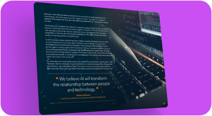 seeing job roles being elevated as a result of AI (i.e. it will allow for employees to focus on more strategic rather than operative tasks) – 64 percent either “strongly” or “completely” agreed with this statement. They don’t see jobs being replaced by AI – they see them being elevated. “We believe AI will transform the relationship between people and technology,” says Athina Kanioura, Chief Data Scientist for Accenture Applied Intelligence. “The real excitement lies with new jobs on the horizon, such as ‘explainers’ who will be responsible for making AI explainable, or ‘trainers’ who will have responsibility for directing the development of AI systems so that they perform at a higher level.” Given the largely positive outlook from these leaders regarding AI’s impact on jobs, other survey findings take on more importance: Nearly 20 percent identify “resistance from employees due to concerns about job security” as a challenge to their AI efforts. Plus, 57 percent agree or strongly agree with the statement, “We are concerned about the impact of AI on employee relations (e.g. employees might feel threatened or overstrained).” So while business and technology leaders anticipate little threat to jobs from AI, many believe that their employees are worried – a concern that can be addressed in part by more education about AI and its real impact on the workplace. For some observers, these results speak to the need for more education in and about AI – fast. “We really need to be focused on opportunities for job creation, because that’s a bigger part of the AI story,” says Intel’s Melvin Greer. Then we can move on to practical considerations, such as the education, training and skills that will be required for people to fill those new jobs.” “ We believe AI will transform the relationship between people and technology. ” Athina Kanioura Chief Data Scientist for Accenture Applied Intelligence 19