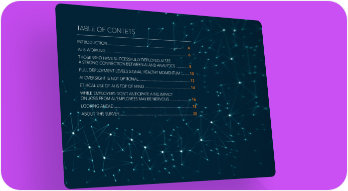 TABLE OF CONTETS INTRODUCTION ........................................................................................4 AI IS WORKING ...........................................................................................6 THOSE WHO HAVE SUCCESSFULLY DEPLOYED AI SEE A STRONG CONNECTION BETWEEN AI AND ANALYTICS ...............8 FULL DEPLOYMENT LEVELS SIGNAL HEALTHY MOMENTUM ..........10 AI OVERSIGHT IS NOT OPTIONAL ..........................................................12 ETHICAL USE OF AI IS TOP OF MIND ....................................................14 WHILE EMPLOYERS DON’T ANTICIPATE A BIG IMPACT ON JOBS FROM AI, EMPLOYEES MAY BE NERVOUS .........................16 LOOKING AHEAD ......................................................................................18 ABOUT THIS SURVEY .................................................................................20