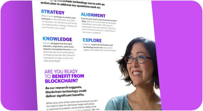 BANKING ON BLOCKCHAIN 9 NEXT STEPS ACCELERATE YOUR ACTION PLAN Leveraging blockchain technology starts with an action plan to address key questions such as: STRATEGY ALIGNMENT What is your strategy to evolve your How do your multi-year investment plans business to the next level and what align with how the available technologies, combination of innovations will be key capabilities, and market offerings are to achieving that strategy? Where will developing? Are you investing / building you find the most value? within the limits of today’s capabilities or tomorrow’s potential? KNOWLEDGE EXPLORE Are you plugged into the right Have you explored the human and industry, regulatory, and cross- technology resources required to industry innovation forums to stay support blockchain DLT environments? informed and be an active player in shaping how the next period of innovation will play out (to your best advantage)? ARE YOU READY TO BENEFIT FROM BLOCKCHAIN? As our research suggests, blockchain technology could deliver significant benefits. While many parts of the investment banking ecosystem first need to align for distributed ledger technology to maximize its potential, we are already seeing some industry leaders demonstrate what is possible, right now. By putting the right pieces in place, allied to a clear vision, you could start to achieve short-term wins while building a more efficient, secure and cost-effective operating model to unlock sustainable gains, savings and long-term competitive advantage.