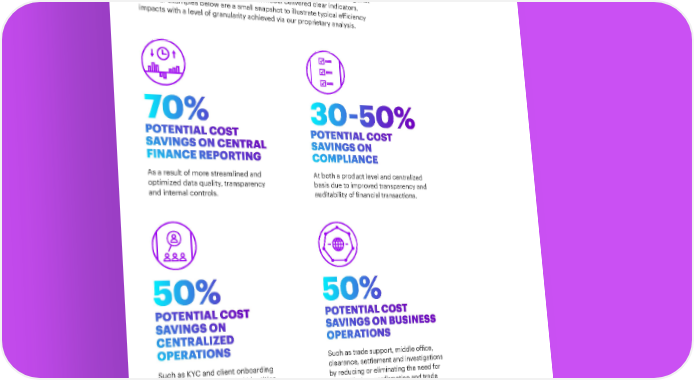 BANKING ON BLOCKCHAIN 5 THE RESULTS Mapping more than 50 operational cost metrics from McLagan’s data against our High Performance Investment Bank model delivered clear indicators. The four examples below are a small snapshot to illustrate typical efficiency impacts with a level of granularity achieved via our proprietary analysis. 70% 30-50% POTENTIAL COST POTENTIAL COST SAVINGS ON CENTRAL SAVINGS ON FINANCE REPORTING COMPLIANCE As a result of more streamlined and At both a product level and centralized optimized data quality, transparency basis due to improved transparency and and internal controls. auditability of financial transactions. 50% 50% POTENTIAL COST POTENTIAL COST SAVINGS ON SAVINGS ON BUSINESS CENTRALIZED OPERATIONS OPERATIONS Such as trade support, middle office, Such as KYC and client onboarding clearance, settlement and investigations due to more robust digital identities by reducing or eliminating the need for and mutualization of client data reconciliation, confirmation and trade among participants. break analysis as key parts of a more efficient and effective clearance and settlement process.