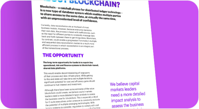 BANKING ON BLOCKCHAIN 3 WHY THE BUZZ ABOUT BLOCKCHAIN? Blockchain – a catchall phrase for distributed ledger technology – is a new type of database system which enables multiple parties to share access to the same data, at virtually the same time, with an unprecedented level of confidence. Currently, data reconciliation sits at the heart of most business models. However, because everyone maintains their own data, the process is beset with inefficiencies, such as the need for different parties to constantly message data back and forth between them to get things done. Blockchain, by contrast, could enable a progression from today’s multiple and sequential data reconciliation models to a much more efficient process in which reconciliation is an integral part of the transactional process. THE OPPORTUNITY The long-term opportunity for banks is to repoint key operational, risk and finance systems to blockchain-based, shared data platforms. This would enable decommissioning of large parts of their process and data infrastructure. While getting to this end-state will take time and multiple iterations, significant potential for cost and efficiency gains should continue to fuel interest and investment. We believe capital Although there have been some estimates of the value blockchain could create, we believe capital markets markets leaders leaders need a more detailed impact analysis to assess the business case for blockchain. This is especially critical need a more detailed for C-suite executives under pressure to constantly evaluate the potential of multiple emerging technologies. With impact analysis to legacy systems to consider, regulation to comply with and stakeholders to convince, how can you be sure that backing assess the business blockchain will deliver the competitive advantage and shareholder value you need? case for blockchain.