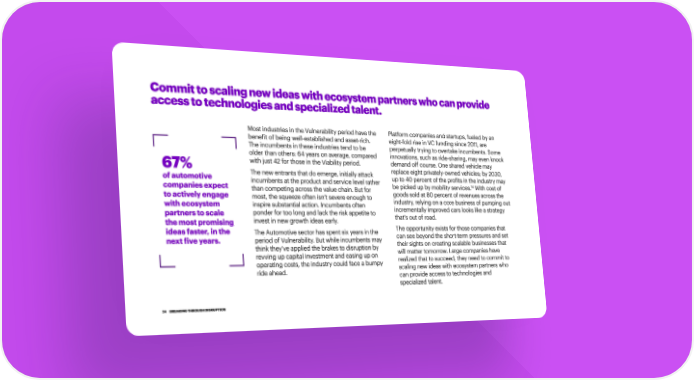 Commit to scaling new ideas with ecosystem partners who can provide access to technologies and specialized talent. Most industries in the Vulnerability period have the Platform companies and startups, fueled by an benefit of being well-established and asset-rich. eight-fold rise in VC funding since 2011, are The incumbents in these industries tend to be perpetually trying to overtake incumbents. Some older than others: 64 years on average, compared innovations, such as ride-sharing, may even knock 67% with just 42 for those in the Viability period. demand off course. One shared vehicle may The new entrants that do emerge, initially attack replace eight privately-owned vehicles; by 2030, of automotive incumbents at the product and service level rather up to 40 percent of the profits in the industry may 14 companies expect than competing across the value chain. But for be picked up by mobility services. With cost of to actively engage most, the squeeze often isn’t severe enough to goods sold at 80 percent of revenues across the with ecosystem inspire substantial action. Incumbents often industry, relying on a core business of pumping out partners to scale ponder for too long and lack the risk appetite to incrementally improved cars looks like a strategy the most promising invest in new growth ideas early. that’s out of road. ideas faster, in the The Automotive sector has spent six years in the The opportunity exists for those companies that next five years. period of Vulnerability. But while incumbents may can see beyond the short-term pressures and set think they’ve applied the brakes to disruption by their sights on creating scalable businesses that revving up capital investment and easing up on will matter tomorrow. Large companies have operating costs, the industry could face a bumpy realized that to succeed, they need to commit to ride ahead. scaling new ideas with ecosystem partners who can provide access to technologies and specialized talent. 24 BREAKING THROUGH DISRUPTION