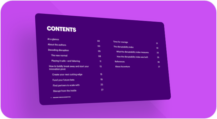CONTENTS At a glance 02 Time for courage 31 About the authors 03 The disruptability index 32 Decoding disruption 05 What the disruptability index measures 33 The new normal 08 How the disruptability index was built 35 Playing it safeāand faltering 11 References 36 How to boldly break away and start your 13 About Accenture 37 innovation pivot Create your next cutting edge 15 Fund your future bets 19 Find partners to scale with 23 Disrupt from the inside 27 4 BREAKING THROUGH DISRUPTION
