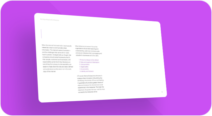Building a Responsible Metaverse When the internet first took hold, it was basically What follows are six areas of focus that viewed as a way to communicate, share organizations should start exploring and information. The internet’s pace of evolution— understanding, right now, to ensure a safe and the challenges that came with it—were and secure metaverse that is as engaging and hard to predict. Hindsight tells us, though, that valuable for businesses as it is for users: companies should adopt frameworks that fit their people, customers and businesses, with 1. Privacy by design and by default responsibility as the North Star. Decisions on 2. Risks and rewards of tokenization everything from privacy to interoperability are 3. Interoperability easier to make when the risks are clearly defined 4. Digital safety and understood, as they were not in the early 5. Sustainability days of the internet. 6. Identity and inclusion Of course, there will always be unknowns in a space where innovation is flourishing. But identifying critical areas of focus and building in guardrails will provide a greater chance of alignment between the intended and actual experiences in the metaverse. The closer this alignment, the greater the trust—and the more successful the metaverse will be. 9
