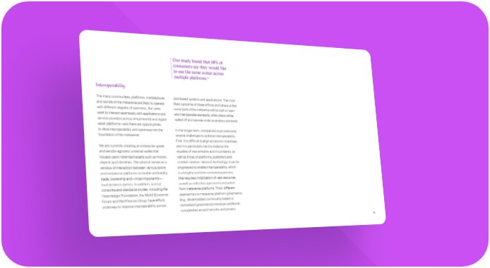 BBuiuilldinding a Rg a Reessppoonnssibiblle Me Meettaavveerrssee Our study found that 68% of consumers say they would like to use the same avatar across multiple platforms.11 Interoperability The many communities, platforms, marketplaces distributed systems and applications. The most and worlds of the metaverse are likely to operate likely outcome of these efforts and others is that with different degrees of openness. But users some parts of the metaverse will be built on open want to interact seamlessly with applications and and interoperable standards, while others will be service providers across virtual worlds and digital walled off and operate under proprietary standards. asset platforms—and there are opportunities to drive interoperability and openness into the In the longer term, companies must overcome foundation of the metaverse. several challenges to achieve interoperability. First, it is difficult to align economic incentives, We are currently creating an enterprise-grade and it is particularly hard to balance the and vendor-agnostic universal wallet that equities of new entrants and incumbents, as houses users’ tokenized assets such as money, well as those of platforms, publishers and objects and identities. The solution serves as a content creators. Second, technology must be window of interaction between various actors engineered to enable interoperability, which and metaverse platforms to enable verifiability, is a lengthy and time-consuming process trade, ownership and—most importantly— that requires mobilization of vast resources, trust between parties. In addition, several as well as collective agreement and action consortia and standards bodies, including the from metaverse platforms. Third, different Hyperledger Foundation, the World Economic approaches to metaverse platform governance Forum and the Khronos Group, have efforts (e.g., decentralized community-based or underway to improve interoperability across centralized governance) introduce additional complexities around security and privacy. 13