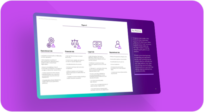 Building a Responsible Metaverse Figure 2 Key Takeaway Companies must decipher what is real and what is hype before engaging with digital assets. Before jumping into the “web3” movement, companies should explore the full range of options, including enterprise-grade platforms and Operational risk Financial risk Legal risk Reputational risk solutions. Whether you are just beginning • Limitations in ensuring data confidentiality • High “gas” fees to transact on certain • Legal and regulatory frameworks • Airdrops of inappropriate or illegal content or expanding your tokenization and data segregation blockchains applicable to digital assets and those who provide services related to them are • Questionable neighbors in virtual worlds journey, start by identifying your • Data corruption or total loss of • Extreme market volatility with respect to currently uncertain strategic objectives, defining what data resulting from failed processes / the value of a specific digital asset • Unverified identities of customers systems or from compromised • Challenges in complying with data your target audience truly values, digital wallets • Unverified identities of customers protection regulations such as GDPR and • Poor user experience and selecting trusted technology CCPA • Security vulnerabilities or loss of • Concerns over fraud, theft and market • Concerns over environmental, solutions and service providers that functionality resulting from unanticipated manipulation • IP infringement, ownership and licensing sustainability and the widening digital address concerns around privacy, changes to a blockchain network (forks) issues may arise with digital assets, divide • Difficulty integrating with third-party especially digital media security and safety. • Unclear governance of the network, payment processors or traditional fiat on/ • Concerns over misuse of personal data, including activities such as business off-ramps • Concerns over being held liable for fraud and theft continuity planning and continuous unknowingly participating in money improvement • Probabilistic settlement finality leading to laundering, sanctions violations or other unclear transaction completion fraudulent behaviors • Unpredictable software releases from opaque open-source governance • Lack of recourse and possible processes indemnification • Conduct that is considered deceptive or unfair and leads to legal penalties • Potential for larger risk exposure given secondary markets for some digital assets 12