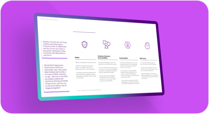 Building a Responsible Metaverse Inclusion, diversity and well-being comprise a growing concern. Consumers under 40 (Millennials and Gen-Z) were more likely to give greater importance to these dimensions than Baby Boomers and Gen-X. Inclusion, Diversity Safety & Accessibility Sustainability Well-being • Safety is the top priority in virtual environments. • Companies should design systems and • Companies should explore ways to use the • The metaverse should be leveraged to Decentralized Autonomous experiences to be inclusive and accessible. metaverse to become net more sustainable enhance and augment real-life experiences. • Platforms must proactively implement by using it as an alternative to energy and Organizations (DAOs) have policies, technologies and practices to • As a new vehicle for fostering empathy and carbon-intensive activities. • Devices, systems and digital environments questionable value. When asked discourage harmful content and behaviors. connection, the metaverse should ideally be should be rooted in preserving and improving about inclusion and diversity, a grounded on universal design principles to • When deciding how to build and select users’ mental and physical health. • Companies should invest in predictive and maximize usability and accessibility. hardware, software and platforms for the core tenet of DAOs, consumers real-time detection capabilities as well as in- metaverse, companies should evaluate • Ultimately, well-being in the metaverse is are split—48% believe that DAOs world features to empower users to manage • Context matters. Users should feel environmental impact, such as energy usage, directly correlated with human-centric design can enhance inclusion and their own safety. empowered to reinvent themselves if emissions, and e-waste. choices across all the dimensions outlined in diversity by allowing community they wish, but certain situations call for this framework. authenticity and real identities. • Users, creators, and operators should be self-governance, 43% have not educated about what they can do to reduce yet formed an opinion, and 9% the environmental footprint of the metaverse. 5 disagreed altogether. Figure 1. Eight dimensions of Responsible Metaverse 7