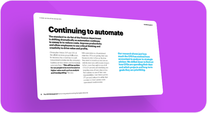 A close-up view of the evolved CFO #CFOReimagined Continuing to automate The standard to-do list of the finance department is shifting dramatically as automation continues to sweep in to reduce costs, improve productivity and allow employees to use critical thinking and creativity to drive value and profits. Christopher Weber, EVP and CFO of With automation as a foundational Our research shows just how the oilfield services group Halliburton, objective, CFOs are getting their own much the CFO has evolved from for instance, has a roadmap to push houses in order to free up the time accountant to analyzer to strategic transactional activities into his company’s they need to branch out and take on advisor. We drilled down to find out business service centers and increasingly entirely new tasks with broader impact. how CFOs are spending their days automate them. “This will free up time In fact, more than eight in ten of all and which projects and long-term for our people to be more focused on CFOs (81 percent) see identifying and higher value work such as analysis targeting areas of new value across goals they are prioritizing. and trendspotting,” he says. the business as one of their main responsibilities. Over three quarters (77 percent) believe it is within their purview to drive business-wide operational transformation. 11 The CFO Reimagined: from driving value to building the digital enterprise