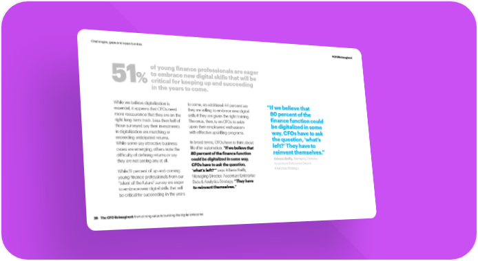 Challenges, gaps and opportunities #CFOReimagined of young finance professionals are eager to embrace new digital skills that will be 51%critical for keeping up and succeeding in the years to come. While we believe digitalization is to come, an additional 44 percent say “ If we believe that essential, it appears that CFOs need they are willing to embrace new digital 80 percent of the more reassurance that they are on the skills if they are given the right training. finance function could right long-term track. Less than half of The onus, then, is on CFOs to seize be digitalized in some those surveyed say their investments upon their employees’ enthusiasm in digitalization are matching or with effective upskilling programs. way, CFOs have to ask exceeding anticipated returns. the question, ‘what’s While some say attractive business In broad terms, CFOs have to think about left?’ They have to cases are emerging, others note the life after automation. “If we believe that reinvent themselves.” difficulty of defining returns or say 80 percent of the finance function they are not seeing any at all. could be digitalized in some way, Athena Reilly, Managing Director, CFOs have to ask the question, Accenture Enterprise Data & While 51 percent of up-and-coming ‘what’s left?’” says Athena Reilly, Analytics Strategy. young finance professionals from our Managing Director, Accenture Enterprise “talent of the future” survey are eager Data & Analytics Strategy. “They have to embrace new digital skills that will to reinvent themselves.” be critical for succeeding in the years 26 The CFO Reimagined: from driving value to building the digital enterprise