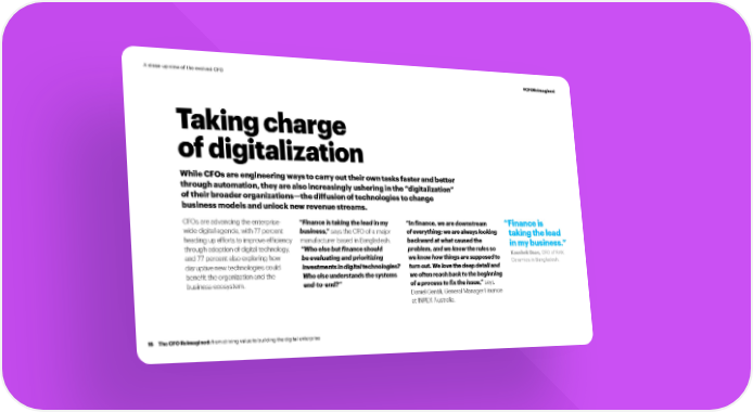 A close-up view of the evolved CFO #CFOReimagined Taking charge of digitalization While CFOs are engineering ways to carry out their own tasks faster and better through automation, they are also increasingly ushering in the “digitalization” of their broader organizations—the diffusion of technologies to change business models and unlock new revenue streams. CFOs are advancing the enterprise- “Finance is taking the lead in my “In finance, we are downstream “ Finance is wide digital agenda, with 77 percent business,” says the CFO of a major of everything; we are always looking taking the lead heading up efforts to improve efficiency manufacturer based in Bangladesh. backward at what caused the in my business.” through adoption of digital technology, “Who else but finance should problem, and we know the rules so Kaushek Daas, CFO of RAK and 77 percent also exploring how be evaluating and prioritizing we know how things are supposed to Ceramics in Bangladesh. disruptive new technologies could investments in digital technologies? turn out. We love the deep detail and benefit the organization and the Who else understands the systems we often reach back to the beginning business ecosystem. end-to-end?” of a process to fix the issue,” says Daniel Gentili, General Manager Finance at INPEX Australia. 15 The CFO Reimagined: from driving value to building the digital enterprise