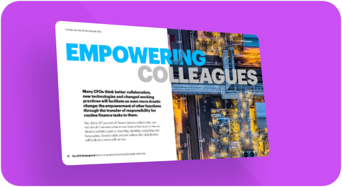 A close-up view of the evolved CFO #CFOReimagined EMPOWERING COLLEAGUES Many CFOs think better collaboration, new technologies and changed working practices will facilitate an even more drastic change: the empowerment of other functions through the transfer of responsibility for routine finance tasks to them. Two-thirds (67 percent) of finance leaders believe they can and should train executives in non-finance functions to take on finance activities such as reporting, planning, budgeting and forecasting. Seventy eight percent believe that digitalization will facilitate a rise in self-service. 17 The CFO Reimagined: from driving value to building the digital enterprise