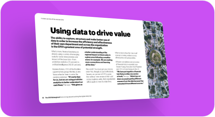A close-up view of the evolved CFO #CFOReimagined Using data to drive value The ability to capture, structure and make better use of data in order to increase the efficiency and effectiveness of their own department and across the organization is the CFO’s greatest area of potential strength. What’s more, finance functions are a better understanding of the What is new is how the “one truth” already using a variety of emerging regional impact on future sales in concept is being realized across tools for better interpretation and a given area following a weather all industries and geographies. impact of the base data—from event, for example. We are making predictive analytics (74 percent) to more connections and learning Efficient compilation and extraction artificial intelligence (AI) (61 percent). all the time.” of financial data is essential, says Steven Young, Executive Vice President Rubens Batista, CFO of the Brazilian The catch? You must get your data in and CFO at Duke Energy in the US. supermarkets group Martins, is one order first, though, to use it effectively. “We have put together a financial finance leader keen to seize the Seventy six percent of CFOs agree hub that provides one version analytics initiative. “It’s early days that without “one version of the truth” of truth,” he says. “Which has cut for us, but we are using predictive across business units, their organization down on people getting different analytics to better understand our will struggle to meet its objectives. answers from the data because they cash flows,” he says. “This gives us extracted it from different sources.” 13 The CFO Reimagined: from driving value to building the digital enterprise
