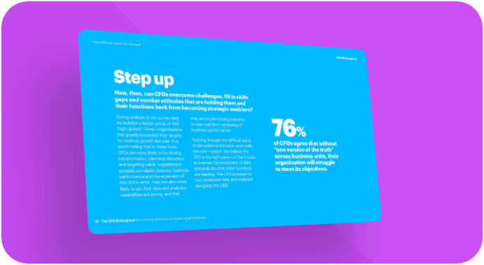 How CFOs can seize the moment #CFOReimagined Step up How, then, can CFOs overcome challenges, fill in skills gaps and combat attitudes that are holding them and their functions back from becoming strategic enablers? During analysis of our survey data, they are implementing real-time we isolated a leader group of 349 or near-real-time monitoring of “high-growth” firms—organizations business performance. 76% that greatly exceeded their targets Pushing through the difficult parts for revenue growth last year. It is of disruption is the best—and really of CFOs agree that without worth noting that in these firms, the only—option. We believe the “one version of the truth” CFOs are more likely to be driving CFO is the right person in the C-suite across business units, their transformation, planning disruption to oversee the ecosystem of data organization will struggle and targeting value, suggesting a and analytics that other functions possible correlation between business are feeding. The CFO is poised to to meet its objectives. performance and the expansion of own enterprise data and analytics the CFO’s remit. They are also more alongside the CEO. likely to say their data and analytics capabilities are strong, and that 31 The CFO Reimagined: from driving value to building the digital enterprise