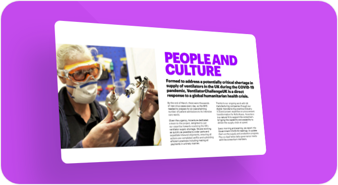 PEOPLE AND CULTURE Formed to address a potentially critical shortage in supply of ventilators in the UK during the COVID-19 pandemic, VentilatorChallengeUK is a direct response to a global humanitarian health crisis. By the end of March, there were thousands Thanks to our ongoing work with UK of new virus cases every day, so the NHS manufacturing companies through our needed to prepare for an overwhelming digital manufacturing practice (industry number of patient admissions to its intensive X.0) and proven expertise on procurement care wards. transformation for Rolls-Royce, Accenture is a natural fit to support the consortium, Given the urgency, Accenture dedicated bringing the capability and scalability to a team to the project, delighted to put deliver the supply chain at speed. our expertise towards resolving the UK’s ventilator supply shortage. We are working Every morning and evening, we report into as quickly as possible to order parts and Government COVID-19 meetings, to update expediate inbound shipments, ensuring all them on the supply and production progress. actions are completed swiftly and upholding Plus co-lead twice daily governance meets efficient practices including making all with the consortium members. payments in a timely manner.