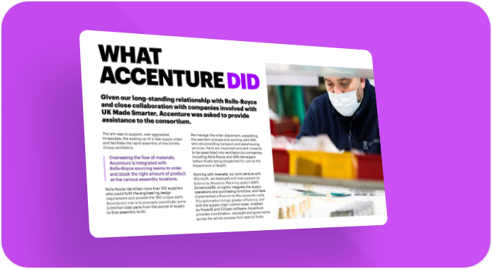 WHAT ACCENTURE DID Given our long-standing relationship with Rolls-Royce and close collaboration with companies involved with UK Made Smarter, Accenture was asked to provide assistance to the consortium. The aim was to support, over aggressive We manage the order placement, expediting timescales, the scaling up of a new supply chain the payment process and working with DHL and facilitate the rapid assembly of the Smiths who are providing transport and warehousing Group ventilators. services. Parts are inspected and sent onwards to be assembled into ventilators by companies Overseeing the flow of materials, including Rolls-Royce and GKN Aerospace Accenture is integrated with before finally being dispatched for use by the Rolls-Royce sourcing teams to order Department of Health. and stock the right amount of product Working with Avanade, our joint venture with at the various assembly locations. Microsoft, we deployed and now support an Enterprise Resource Planning system (ERP), Rolls-Royce identified more than 100 suppliers Dynamics365, to tightly integrate the supply who could fulfil the engineering design operations and purchasing functions, and have requirement and provide the 292 unique parts. implemented a Procure-to-Pay accounts cycle. Accenture’s role is to precisely coordinate some This automation brings greater efficiency, and 3.4million total parts from the source of supply with the supply chain control tower, enabled to final assembly build. by PowerBI and E2Open software, Accenture provides coordination, oversight and governance across the whole process from start to finish.