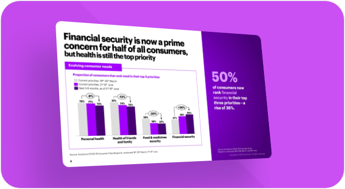 Financial security is now a prime concern for half of all consumers, but health is still the top priority Evolving consumer needs Proportion of consumers that rank need in their top 3 priorities 50% th th Current priorities, 19 -25 March nd th Current priorities, 2 -8 June of consumers now nd th Next 3-6 months, as of 2 -8 June rank financial -8% -13% security in their top 78% 77% 81% three priorities—a 72% 74% 70% +36% rise of 36%. -30% 45% 50% 39% 37% 28% 27% Personal health Health of friends Food & medicines Financial security and family security th th nd th Source: Accenture COVID-19 Consumer Pulse Research, conducted 19 -25 March, 2 -8 June. Source: Accenture COVID-19 Consumer Pulse Research, conducted 19th-25th March, 2nd-8th June. 4