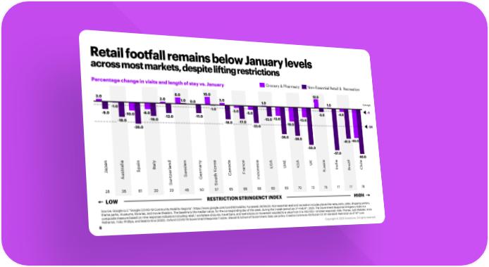 Retail footfall remains below January levels across most markets, despite lifting restrictions Percentage change in visits and length of stay vs. January Grocery & Pharmacy Non-Essential Retail & Recreation 8.0 10.0 12.0 3.0 2.0 1.0 0.0 3.0 1.0 1.0 Average -1.0 -1.0 -3.0 -4.0 -4 -9.0 -8.0 -5.0 -5.0 -10.0 -12.0 -11.0 -13.0 -12.0 -13.0 -18.0 -16.0 -18.0 -17.0 -19.0 -24 -26.0 -22.0 -36.0 -38.0 -40.0 -41.0 -50.0 -57.0 l -62.0 a n y y a a a E a a i e i i i z l an al al nd en e ce SA SA UK di a i t a ad UA K ssi r Spa I l ed man or an nes U u In Br Ch Jap st er w r K r o R u z S e h Can F t A i G nd w out I S S 28 36 61 39 39 46 50 57 65 66 68 69 69 70 73 75 77 77 78 LOW RESTRICTION STRINGENCY INDEX HIGH Source: Google LLC "Google COVID-19 Community Mobility Reports". https://www.google.com/covid19/mobility/ Accessed: 26/06/20. Non-essential retail and recreation includes places like restaurants, cafes, shopping centers, rd th theme parks, museums, libraries, and movie theaters. The baseline is the median value, for the corresponding day of the week, during the 5-week period Jan 3 –Feb 6 , 2020. The Government Response Stringency Index is a composite measure based on nine response indicators including retail / workplace closures, travel bans, and restrictions on movement rescaled to a value from 0 to 100 (100 = strictest response). Hale, Thomas, Sam Webster, Anna th Petherick, Toby Phillips, and Beatriz Kira (2020). Oxford COVID-19 Government Response Tracker, BlavatnikSchool of Government. Data use policy: Creative Commons Attribution CC BY standard. Restriction as of 16 June 6