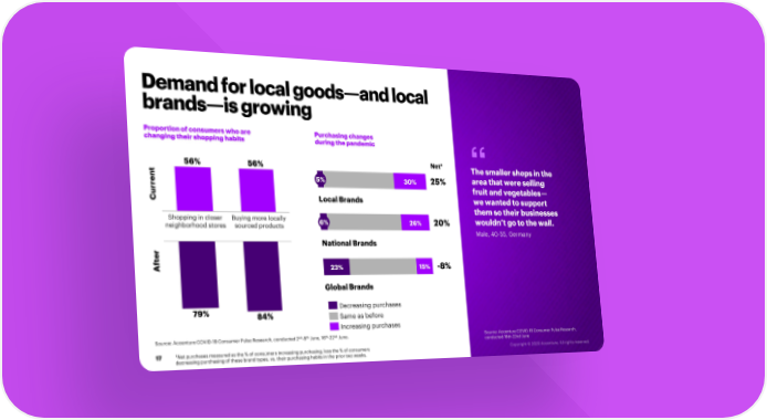 Demand for local goods—and local brands—is growing Proportion of consumers who are Purchasing changes changing their shopping habits during the pandemic 56% 56% Net* The smaller shops in the nt “ 5% 30% 25% area that were selling rre fruit and vegetables— u Local Brands we wanted to support C them so their businesses Shopping in closer Buying more locally 6% 26% 20% wouldn’t go to the wall. neighborhood stores sourced products Male, 40-55, Germany r National Brands te f 23% 15% -8% A Global Brands 79% Decreasing purchases 84% Same as before Increasing purchases nd th th nd Source: Accenture COVID-19 Consumer Pulse Research, conducted 2 -8 June, 16 -22 June. Source: Accenture COVID-19 Consumer Pulse Research, conducted 16th-22nd June 17 *Net purchases measured as the % of consumers increasing purchasing, less the % of consumers decreasing purchasing of these brand types, vs. their purchasing habits in the prior two weeks.