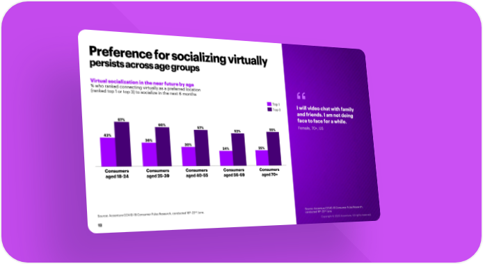 Preference for socializing virtually persists across age groups Virtual socialization in the near future by age % who ranked connecting virtually as a preferred location (ranked top 1 or top 3) to socialize in the next 6 months Top 1 I will video chat with family Top 3 “ and friends. I am not doing 67% face to face for a while. 60% 57% 55% Female, 70+, US 52% 43% 36% 30% 25% 24% Consumers Consumers Consumers Consumers Consumers aged 18-24 aged 25-39 aged 40-55 aged 56-69 aged 70+ th nd Source: Accenture COVID-19 Consumer Pulse Research, conducted 16 -22 June. Source: Accenture COVID-19 Consumer Pulse Research, th nd conducted 16 -22 June 12