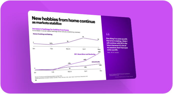 New hobbies from home continue as markets stabilize Increase in hashtags for hobbies from home % increase in social media hashtags since January (stabilizing markets) Home Cooking and Baking 4x One thing I've come up with 3x “ that is fun is baking. I think I 2x will continue with [it] in the 1 0.7x future because it is one of my passions that I have just Jan Feb March April May come up with. +65% Male, 18-24, Sweden DIY, Home Décor and Gardening +32% +17% Arts & Crafts +19% 11 +8 +11% Jan Feb March April May Source: Accenture social listening analysis Jan-May 2020. Source: Accenture COVID-19 Consumer Pulse Research, th nd Stabilizing markets included: Canada, Australia, France, Germany, Italy, Japan, Spain, South Korea, Switzerland, UAE conducted 16 -22 June 13