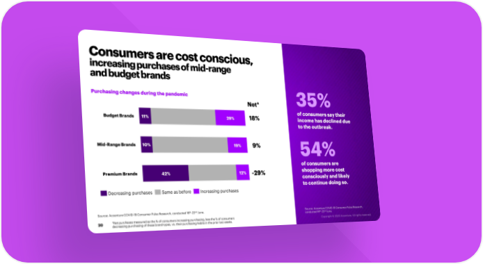 Consumers are cost conscious, increasing purchases of mid-range and budget brands Purchasing changes during the pandemic 35% Net* of consumers say their Budget Brands 11% 29% 18% income has declined due to the outbreak. Mid-Range Brands 10% 19% 9% 54% of consumers are Premium Brands 42% 12% -29% shopping more cost consciously and likely to continue doing so. Decreasing purchases Same as before Increasing purchases th nd Source: Accenture COVID-19 Consumer Pulse Research, conducted 16 -22 June. Source: Accenture COVID-19 Consumer Pulse Research, th nd conducted 16 -22 June. 20 *Net purchases measured as the % of consumers increasing purchasing, less the % of consumers decreasing purchasing of these brand types, vs. their purchasing habits in the prior two weeks.