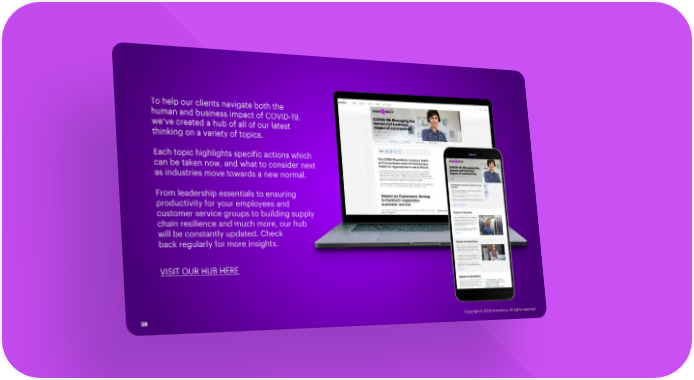 To help our clients navigate both the human and business impact of COVID-19, we’ve created a hub of all of our latest thinking on a variety of topics. Each topic highlights specific actions which can be taken now, and what to consider next as industries move towards a new normal. From leadership essentials to ensuring productivity for your employees and customer service groups to building supply chain resilience and much more, our hub will be constantly updated. Check back regularly for more insights. VISIT OUR HUB HERE 28 Copyright © 2020 Accenture. All rights reserved.