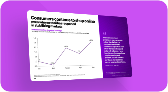 Consumers continue to shop online even where retail has reopened in stabilizing markets Increase in online shopping hashtags % change in social media hashtags for online shopping since January (stabilizing markets) I have shopped and “ 1.5 +45% purchased more products online than before the 1.4 coronavirus and I will +30% continue this practice even 1.3 when the restrictions and 1.2 17% outbreak subsides. I have found the online experience 1.1 very interesting and 1 pleasant and the delivery 1.0 service to my residence -10% very prompt and courteous. 0.9 Female,56-69, Australia Jan Feb March April May Source: Accenture social listening analysis Jan-May 2020 Source: Accenture COVID-19 Consumer Pulse Research, th nd Stabilizing markets included: Canada, Australia, France, Germany, Italy, Japan, Spain, South Korea, Switzerland, UAE conducted 16 -22 June. 23