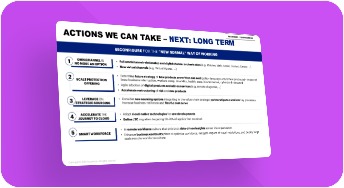 PRELIMINARY –FOR DISCUSSION ACTIONS WE CAN TAKE –NEXT: LONG TERM PRIORITIES PRIORITIES DESCRIPTION RECONFIGUREFOR THE “NEW NORMAL” WAY OF WORKING 1 OMNICHANNEL IS • Full omnichannel relationship and digital channel orchestration (e.g. Mobile / Web, Social, Contact Center, …) NO MORE AN OPTION • New virtual channels (e.g. Virtual Agents, …) 2 • Determine future strategyof how products are written and sold (policy language and/or new products) – impacted SCALE PROTECTION lines: business interruption, workers comp, disability, health, auto, inland marine, cyber) and reinsured OFFERING • Agile adoption of digital products and add-on services (e.g. remote diagnosis, …) • Accelerate restructuring ofrisk and new products 3 LEVERAGE ON • Consider new sourcing optionsintegrating in the value chain strategic partnerships to transform key processes, STRATEGIC SOURCING increase business resilience and flex the cost curve 4 ACCELERATE THE • Adopt cloud-native technologies for new developments JOURNEY TO CLOUD • Define J2C migration targeting 50-70% of application on cloud 5 • A remoteworkforceculture that embraces data-driven insights across the organization SMART WORKFORCE • Enhance business continuity plans to optimize workforce, mitigate impact of travel restrictions, and deploy large scale remote workforce culture Copyright © 2020 Accenture. All rightsreserved.