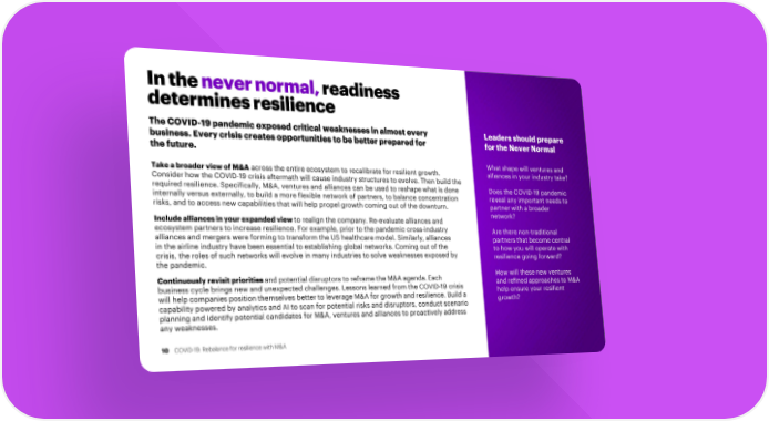 In the never normal, readiness determines resilience The COVID-19 pandemic exposed critical weaknesses in almost every Leaders should prepare business. Every crisis creates opportunities to be better prepared for for the Never Normal the future. Take a broader view of M&A across the entire ecosystem to recalibrate for resilient growth. What shape will ventures and alliances in your industry take? Consider how the COVID-19 crisis aftermath will cause industry structures to evolve. Then build the required resilience. Specifically, M&A, ventures and alliances can be used to reshape what is done Does the COVID-19 pandemic internally versus externally, to build a more flexible network of partners, to balance concentration reveal any important needs to risks, and to access new capabilities that will help propel growth coming out of the downturn. partner with a broader Include alliances in your expanded view to realign the company. Re-evaluate alliances and network? ecosystem partners to increase resilience. For example, prior to the pandemic cross-industry Are there non-traditional alliances and mergers were forming to transform the US healthcare model. Similarly, alliances partners that become central in the airline industry have been essential to establishing global networks. Coming out of the to how you will operate with crisis, the roles of such networks will evolve in many industries to solve weaknesses exposed by resilience going forward? the pandemic. Continuously revisit priorities and potential disruptors to reframe the M&A agenda. Each How will these new ventures business cycle brings new and unexpected challenges. Lessons learned from the COVID-19 crisis and refined approaches to M&A will help companies position themselves better to leverage M&A for growth and resilience. Build a help ensure your resilient capability powered by analytics and AI to scan for potential risks and disruptors, conduct scenario growth? planning and identify potential candidates for M&A, ventures and alliances to proactively address any weaknesses. 10 COVID-19: Rebalance for resilience with M&A