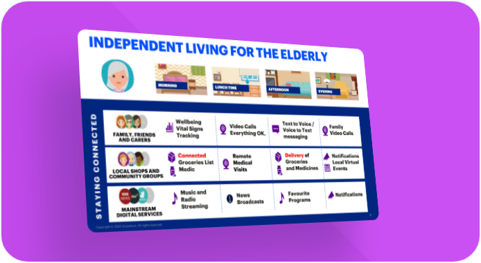 INDEPENDENT LIVING FOR THE ELDERLY MORNING LUNCH TIME AFTERNOON EVENING DE Wellbeing Text to Voice / Family T Vital Signs Video Calls Voice to Text Video Calls C FAMILY, FRIENDS Tracking Everything OK, messaging E AND CARERS N N Connected Remote Delivery of Notifications O Groceries List Medical Groceries Local Virtual C LOCAL SHOPS AND Medic Visits and Medicines Events G COMMUNITY GROUPS NI Y Music and News Favourite A Radio Broadcasts Programs Notifications T MAINSTREAM Streaming S DIGITAL SERVICES Copyright © 2020 Accenture. All rightsreserved. 9