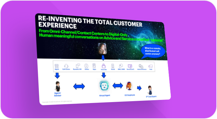 RE-INVENTING THE TOTAL CUSTOMER EXPERIENCE From Omni-Channel/Contact Centers to Digital-Only Human meaningful conversations on Advice and Service crucial but “optional” What is a remote, distributed call centre anyway? Agent Call Center Dynamic IVR Online Apps Voice Bot Social SMS / USSD Devices (IoT) Indirect Partners Field Agent/ Adviser Virtual Agent CC Employee 3rdLine Expert Copyright © 2020 Accenture. All rightsreserved.