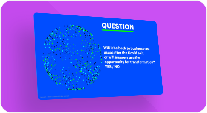 QUESTION Will it be back to business-as- usual after the Covid exit or will insurers use the opportunity for transformation? YES / NO Copyright © 2020 Accenture. All rightsreserved.