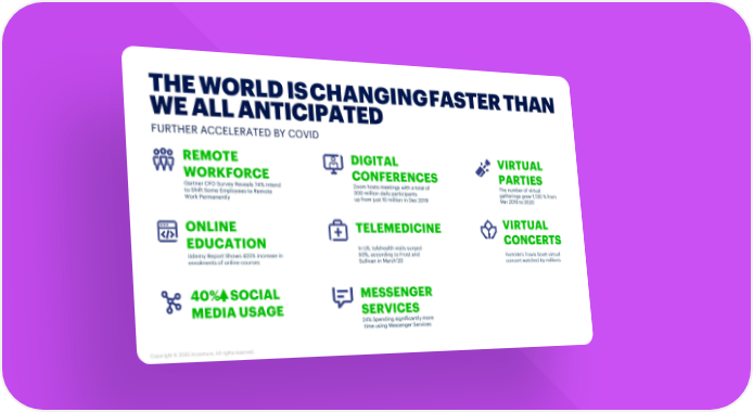 THE WORLD IS CHANGINGFASTER THAN CHANGING WE ALL ANTICIPATED FURTHER ACCELERATED BY COVID REMOTE DIGITAL VIRTUAL WORKFORCE CONFERENCES PARTIES Gartner CFO Survey Reveals 74% Intend Zoom hosts meetings with a total of The number of virtual to Shift Some Employees to Remote 300 million daily participants gatherings grew 1,130 % from Work Permanently up from just 10 million in Dec 2019 Mar 2019 to 2020 ONLINE TELEMEDICINE VIRTUAL EDUCATION CONCERTS In US, telehealth visits surged UdemyReport Shows 425% increase in 50%, according to Frost and Fortnite's Travis Scott virtual enrolments of online courses Sullivan in March’20 concert watched by millions 40% SOCIAL MESSENGER MEDIA USAGE SERVICES 24% Spending significantly more time using Messenger Services Copyright © 2020 Accenture. All rightsreserved.