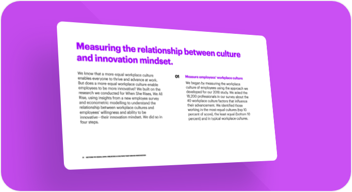 Measuring the relationship between culture and innovation mindset. We know that a more-equal workplace culture 01 Measure employees’ workplace culture enables everyone to thrive and advance at work. We began by measuring the workplace But does a more-equal workplace culture enable culture of employees using the approach we employees to be more innovative? We built on the developed for our 2018 study. We asked the research we conducted for When She Rises, We All 18,200 professionals in our survey about the Rise, using insights from a new employee survey 40 workplace culture factors that influence and econometric modelling to understand the their advancement. We identified those relationship between workplace cultures and working in the most-equal cultures (top 10 employees’ willingness and ability to be percent of score), the least equal (bottom 10 innovative—their innovation mindset. We did so in percent) and in typical workplace cultures. four steps. 31 GETTING TO EQUAL 2019: CREATING A CULTURE THAT DRIVES INNOVATION