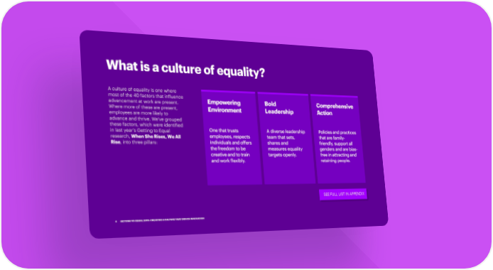 What is a culture of equality? A culture of equality is one where most of the 40 factors that influence Empowering Bold Comprehensive advancement at work are present. Where more of these are present, Environment Leadership Action employees are more likely to advance and thrive. We’ve grouped these factors, which were identified One that trusts A diverse leadership Policies and practices in last year’s Getting to Equal employees, respects team that sets, that are family- research, When She Rises, We All Rise, into three pillars: individuals and offers shares and friendly, support all the freedom to be measures equality genders and are bias- creative and to train targets openly. free in attracting and and work flexibly. retaining people. SEE FULL LIST IN APPENDIX 4 GETTING TO EQUAL 2019: CREATING A CULTURE THAT DRIVES INNOVATION