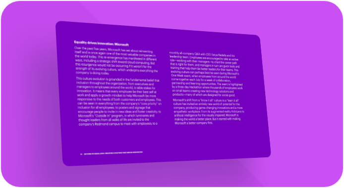 Equality drives innovation: Microsoft Over the past five years, Microsoft has set about reinventing monthly all-company Q&A with CEO Satya Nadella and his itself and is once again one of the most valuable companies in leadership team. Employees are encouraged to take an active the world today. This re-emergence has manifested in different role—working with their managers—to chart the career path ways, including a strategic shift toward cloud computing. But that is right for them, and managers in turn are given tools and this resurgence would not be occurring if it weren’t for the training that help them be better leaders for their teams. This strength of its evolving culture, which underpins everything the evolving culture can perhaps best be seen during Microsoft’s company is doing today. One Week event, when employees from around the world This culture evolution is grounded in the fundamental belief that come together each July for a week of collaboration, inclusion throughout the organization, from executives and partnership and learning opportunities. The event is highlighted managers to employees around the world, is table stakes for by a three-day Hackathon where thousands of employees work innovation. It means that every employee be their best self at on small teams creating new technology solutions and work and apply a growth mindset to help Microsoft be more products—many of which are designed for social good. responsive to the needs of both customers and employees. This Microsoft’s shift from a “know it all” culture to a “learn it all” can be seen in everything from the company’s “core priority” on culture has invited an entirely new world of potential for the inclusion for all employees; to posters and signage that company, producing game-changing innovations and a more encourage people to invite in new ideas and foster creativity; to empathetic workplace. From its augmented reality HoloLens to Microsoft’s “Outside In” program, in which luminaries and artificial intelligence for the visually impaired, Microsoft is thought leaders from all walks of life are invited to the making the world a better place. But it started with making company’s Redmond campus to meet with employees; to a Microsoft a better company first. 16 GETTING TO EQUAL 2019: CREATING A CULTURE THAT DRIVES INNOVATION