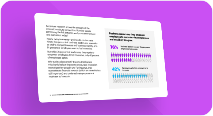 Accenture research shows the strength of the innovation-culture connection. How are people Business leaders say they empower perceiving the link between workplace environment employees to innovate—but employees and innovation today? are less likely to agree. Nearly everyone wants—and needs—to innovate. Ninety-five percent of business leaders see innovation as vital to competitiveness and business viability, and 76% Business leaders who say they empower 91 percent of employees want to be innovative. employees to innovate But while 76 percent of leaders say they regularly empower employees to be innovative, only 42 percent of employees agree. Why such a disconnect? It seems that leaders mistakenly believe that some encourage innovation more than they actually do. For instance, they 42% Employees who feel empowered to overestimate financial rewards (which are nevertheless innovate still important) and underestimate purpose as a motivator to innovate. 14 GETTING TO EQUAL 2019: CREATING A CULTURE THAT DRIVES INNOVATION