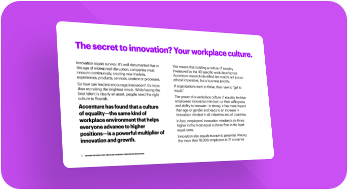The secret to innovation? Your workplace culture. Innovation equals survival. It’s well documented that in This means that building a culture of equality this age of widespread disruption, companies must (measured by the 40 specific workplace factors innovate continuously, creating new markets, Accenture research identified last year) is not just an experiences, products, services, content or processes. ethical imperative, but a business priority. So how can leaders encourage innovation? It’s more If organizations want to thrive, they have to “get to than recruiting the brightest minds. While having the equal.” best talent is clearly an asset, people need the right The power of a workplace culture of equality to drive culture to flourish. employees’ innovation mindset—or their willingness Accenture has found that a culture and ability to innovate—is strong. It has more impact of equality—the same kind of than age or gender and leads to an increase in workplace environment that helps innovation mindset in all industries and all countries. In fact, employees’ innovation mindset is six times everyone advance to higher higher in the most-equal cultures than in the least- positions—is a powerful multiplier of equal ones. innovation and growth. Innovation also equals economic potential. Among the more than 18,000 employees in 27 countries 2 GETTING TO EQUAL 2019: CREATING A CULTURE THAT DRIVES INNOVATION