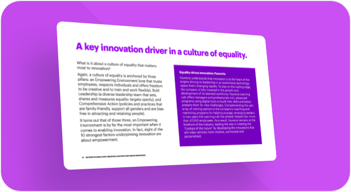 A key innovation driver in a culture of equality. What is it about a culture of equality that matters most to innovation? Equality drives innovation: Faurecia Again, a culture of equality is anchored by three Faurecia understands that innovation is at the heart of the pillars: an Empowering Environment (one that trusts engine driving its leadership in an automotive technology employees, respects individuals and offers freedom space that’s changing rapidly. To stay on the cutting edge, to be creative and to train and work flexibly), Bold the company is fully invested in the growth and Leadership (a diverse leadership team that sets, development of its talented workforce. Faurecia Learning shares and measures equality targets openly), and Lab offers managers and professionals rich, advanced Comprehensive Action (policies and practices that programs using digital tools to build their skills and better prepare them for new challenges. Complementing the vast are family-friendly, support all genders and are bias- array of training options is the company’s coaching and free in attracting and retaining people). mentoring programs for helping younger, emerging leaders. It turns out that of those three, an Empowering In two years the Learning Lab has already helped train more Environment is by far the most important when it than 47,000 employees. As a result, Faurecia remains at the forefront of the industry, leading the way in creating the comes to enabling innovation. In fact, eight of the “Cockpit of the Future” by developing the innovations that 10 strongest factors underpinning innovation are will make vehicles more intuitive, connected and about empowerment. personalized. 18 GETTING TO EQUAL 2019: CREATING A CULTURE THAT DRIVES INNOVATION