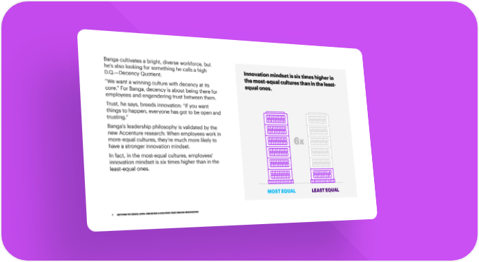 Banga cultivates a bright, diverse workforce, but he’s also looking for something he calls a high Innovation mindset is six times higher in D.Q.—Decency Quotient. the most-equal cultures than in the least- “We want a winning culture with decency at its equal ones. core.” For Banga, decency is about being there for employees and engendering trust between them. Trust, he says, breeds innovation: “If you want things to happen, everyone has got to be open and trusting.” Banga’s leadership philosophy is validated by the new Accenture research: When employees work in more-equal cultures, they’re much more likely to 6x have a stronger innovation mindset. In fact, in the most-equal cultures, employees’ innovation mindset is six times higher than in the least-equal ones. MOST EQUAL LEAST EQUAL 7 GETTING TO EQUAL 2019: CREATING A CULTURE THAT DRIVES INNOVATION