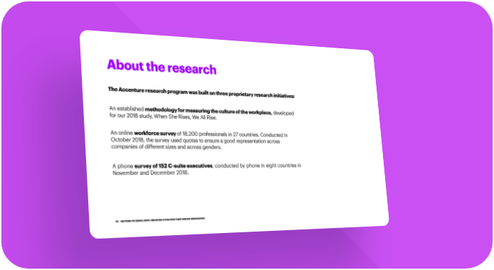 About the research The Accenture research program was built on three proprietary research initiatives: An established methodology for measuring the culture of the workplace, developed for our 2018 study, When She Rises, We All Rise. An online workforce survey of 18,200 professionals in 27 countries. Conducted in October 2018, the survey used quotas to ensure a good representation across companies of different sizes and across genders. A phone survey of 152 C-suite executives, conducted by phone in eight countries in November and December 2018. 30 GETTING TO EQUAL 2019: CREATING A CULTURE THAT DRIVES INNOVATION