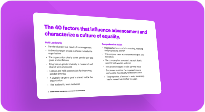The 40 factors that influence advancement and characterize a culture of equality. Bold Leadership Comprehensive Action • G ender diversity is a priority for management • Progress has been made in attracting, retaining • A diversity target or goal is shared outside the and progressing women organization • The company has a women’s network open only • The organization clearly states gender pay gap to women goals and ambitions • The company has a women’s network that is • P rogress on gender diversity is measured and open to both women and men shared with employees • Men are encouraged to take parental leave • L eaders are held accountable for improving • Employees trust that the organization pays gender diversity women and men equally for the same work • A diversity target or goal is shared inside the • The proportion of women in senior leadership organization has increased over the last five years • The leadership team is diverse 27 GETTING TO EQUAL 2019: CREATING A CULTURE THAT DRIVES INNOVATION