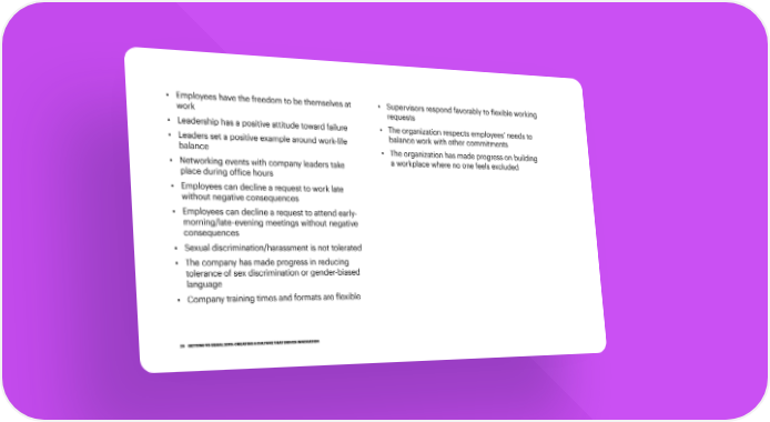 • Employees have the freedom to be themselves at • Supervisors respond favorably to flexible working work requests • Leadership has a positive attitude toward failure • The organization respects employees’ needs to • Leaders set a positive example around work-life balance work with other commitments balance • The organization has made progress on building • Networking events with company leaders take a workplace where no one feels excluded place during office hours • Employees can decline a request to work late without negative consequences • Employees can decline a request to attend early- morning/late-evening meetings without negative consequences • S exual discrimination/harassment is not tolerated • The company has made progress in reducing tolerance of sex discrimination or gender-biased language • Company training times and formats are flexible 29 GETTING TO EQUAL 2019: CREATING A CULTURE THAT DRIVES INNOVATION