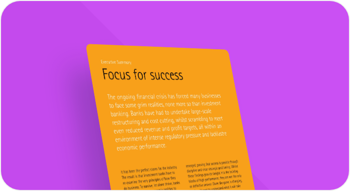 Executive Summary Focus for success The ongoing financial crisis has forced many businesses to face some grim realities, none more so than investment banking Banks have had to undertake largescale restructuring and cost cutting, hilst scrambling to meet even reduced revenue and rofit targets, all ithin an environment of intense regulatory ressure and lacklustre economic erformance It has been the erfect storm for the industry emerged, roving that success is ossible through The result is that investment banks have to disciline and clear strategic ositioning hilst reexamine the very rinciles of ho they these findings rovide insight into the building do business To survive, let alone thrive, banks blocks of high erformance, they are not the only have to use the ne economic realities to or definitive anser iven the game is changing, fundamentally reform the ay they aroach banks ill need to understand hat it ill take the market, and ensure they remain relevant to be high erforming in this ne era to their clients To this end, our study has identified a number It is because of this aradigm shift that €ccenture of key characteristics that ill define the ne has conducted a detailed examination of hat industry Banks ill have to face u to multile it ill take for banks to be high erforming in s ueees on rofitability, ithin an increasingly this ne era ith over „… years orking at the comlex marketlace, all under rising cometitive heart of the industry, €ccenture has a uni ue ressures The combination of these factors leaves ersective on hat it takes for banks to be high little margin for error Banks need to diligently erforming e have seen a number of banks focus on those areas that ill generate sufficient rise and fall, building extraordinarily rofitable returns and are relevant to their clients businesses before sectacularly crashing †n Building a strategy in such an uncertain and many occasions, as banks’ senior managers volatile environment is challenging Hoever, readily admit, banks dodged a bullet They ere market dislocation ill bring oortunities for able to avoid structural change by hiding behind those able to look beyond shortterm concerns high rofits and extraordinary revenue groth To take advantage, banks need to build structural rates Hoever, as €ndre Haldane at the Bank change into their strategic lanning To rovide of England recently noted, ‘the urchaser of a banks ith the tools to drive this rocess, ortfolio of global banking stocks in the early €ccenture has identified five business models to ‰ ‰ŠŠ…s is today sitting on a real loss’ ‹learly, hel understand ho to reach high erformance no is a time to reassess and rebuild in the ne era These are‚ To better understand hat has driven high • The Flow Monster, hich harnesses highly erformance in the ast, €ccenture has carried efficient infrastructure to rocess huge trade out a detailed financial analysis of the recent volumes at tight sreads erformance of ‰Œ leading investment banks, as • The Regional Champion, hich crosssells ell as reflecting on historical trends This has risk management and financing solutions to an rovided insight into the recent inners but, more existing client base of midsied cororates imortantly, has shon that banks have achieved high erformance through multile routes To • The Product Specialist, hich achieves traditional scale layers have stretched clear of the cometitive differentiation through niche ack, but three smaller ‘focused inners’ have also roduct offerings
