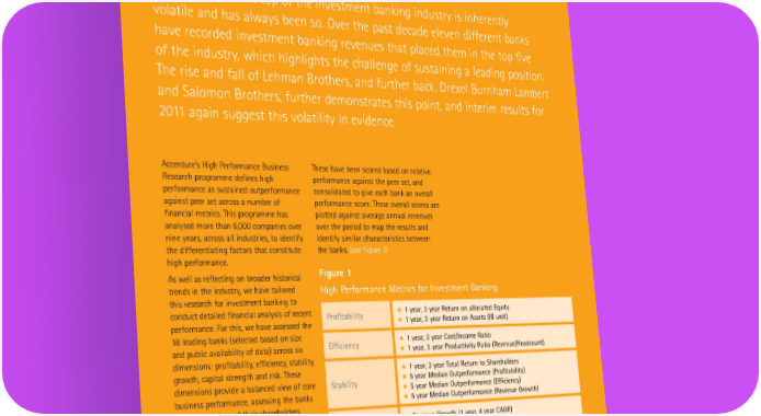 Full ReportFull Report The Anatom of High Performance Performance at the top of the investment ‚anking industr is inherentl volatile and has alas ‚een soˆ ˜ver the past decade eleven different ‚anks have recorded investment ‚anking revenues that placed them in the top five of the industr‡ hich highlights the challenge of sustaining a leading positionˆ The rise and fall of ›ehman Brothers‡ and further ‚ack‡ œre‘el Burnham ›am‚ert and Salomon Brothers‡ further demonstrates this point‡ and interim results for 2”€€ again suggest this volatilit in evidenceˆ Accenture’s High Performance Business These have ‚een scored ‚ased on relative Research programme defines high performance against the peer set‡ and performance as sustained outperformance consolidated to give each ‚ank an overall against peer set across a num‚er of performance scoreˆ These overall scores are financial metricsˆ This programme has plotted against average annual revenues analsed more than †‡””” companies over over the period to map the results and nine ears‡ across all industries‡ to identif identif similar characteristics ‚eteen the differentiating factors that constitute the ‚anksˆ –see figure 2— high performanceˆ As ell as reflecting on ‚roader historical Figure 1 trends in the industr‡ e have tailored High Performance Metrics for Investment Banking this research for investment ‚anking to conduct detailed financial analsis of recent Profitability 1 year, 3 year Return on allocated Euity performanceˆ For this‡ e have assessed the 1 year, 3 year Return on ssets IB unit €• leading ‚anks –selected ‚ased on siŽe 1 year, 3 year ostIncome Ratio and pu‚lic availa‚ilit of data— across si‘ Efficiency 1 year, 3 year Productivity Ratio RevenueHeadcount dimensions profita‚ilit‡ efficienc‡ sta‚ilit‡ groth‡ capital strength and riskˆ These 1 year, 3 year otal Return to hareholders dimensions provide a ‚alanced vie of core tability € year Median ‚utƒerformance Profitability ‚usiness performance‡ assessing the ‚anks € year Median ‚utƒerformance Efficiency € year Median ‚utƒerformance Revenue „ro…th through the lens of their shareholdersˆ ˜ur analsis covers the last three Revenue „ro…th 1 year, † year „R full financial ears‡ revieing ™ust the „ro…th onsensus nalyst ‚utlook 3 year average investment ‚anking unit in the case of omƒetitive Market Ranking 1 year universal ‚anksˆ This period has ‚een an ore ier 1 aƒital Ratio 3 year average e‘traordinar time for the industr – from aƒital trength ‡everage Ratio 3 year average crisis to recover to tur‚ulence again – ‚ut ‡iuidity Ratio 3 year average the a‚ilit to deal ith adversit provides telling performance lessonsˆ šach dimension ˆaR annual average, 3 year ƒeriod has ‚een eŒuall eighted and has ‚een Risk ˆaR ˆolatility annual, 3 year ƒeriod assessed through a num‚er of industr 1 year, 3 year Risk‰Šeighting specific financial metricsˆ –see figure €— Source Accenture Research