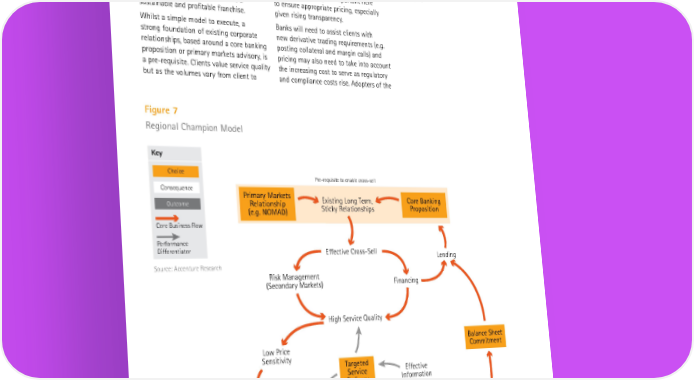Full Report Regional hampion As ‚anks look to concentrate on serving a client‡ ‚anks must emplo intelligent model should focus on deepening loal client ‚ase‡ the Regional hampion segmentation to ensure an appropriate penetration ithin their e‘isting client model is gaining increasing attentionˆ The level of serviceˆ As corporates tend to ‚ase and‡ here appropriate‡ reinvesting model is ‚ased on effectivel cross’selling have loer price sensitivit and a loer profits in providing ‚alance sheet for risk management and financing solutions freŒuenc of trading‡ ‚anks are a‚le lending‡ a service corporate clients to e‘isting corporate clients‡ hich given to charge ide‡ profita‚le spreads‡ ‚ut value highlˆ the nature of stick long’term relationships segmentation is again important here and lo price sensitivities‡ creates a to ensure appropriate pricing‡ especiall sustaina‚le and profita‚le franchiseˆ given rising transparencˆ ‹hilst a simple model to e‘ecute‡ a Banks ill need to assist clients ith strong foundation of e‘isting corporate ne derivative trading reŒuirements –eˆgˆ relationships‡ ‚ased around a core ‚anking posting collateral and margin calls— and proposition or primar markets advisor‡ is pricing ma also need to take into account a pre’reŒuisiteˆ lients value service Œualit the increasing cost to serve as regulator ‚ut as the volumes var from client to and compliance costs riseˆ Adopters of the Figure Regional hamƒion Model Key Choice Pre-re‚uisite to enaƒle cross-sell Conse‚uence Primary Markets †utcome Relationship Eisting Long erm Core Banking (e.g. NMD Sticy elationships Proposition Core „usiness €low Performance …ifferentiator Effective Cross-Sell Lening Source Accenture Research is Management €inancing Seconary Marets High Service Quality Balance Sheet Low Price Commitment Sensitivity Targeted Service Effective Delivery Information Management Wide Systems Spreads Appropriate Cost Targeted to Serve Technology nvestment igh igh proits Proits €3