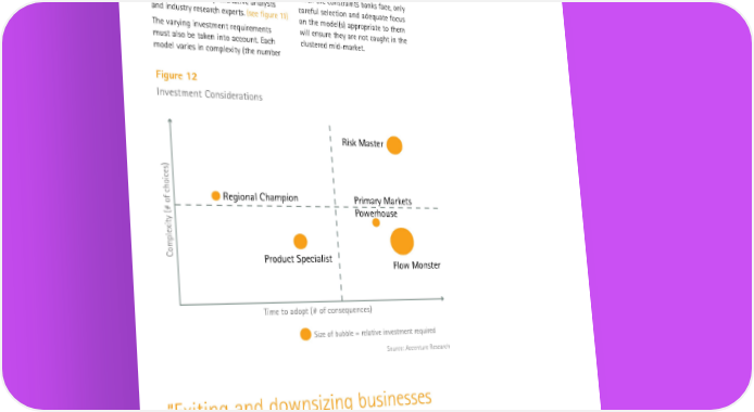Full Report Although man of these capa‚ilities of choices‡ reflecting the management are u‚iŒuitous across the models‡ the co’ordination and organisation alignment focus of investment varies‡ meaning reŒuired—‡ time to adopt –the num‚er of that capa‚ilities are rarel transfera‚leˆ conseŒuences‡ reflecting the time taken For instance‡ Flo „onsters and Product for the effects of the choices to resonate Specialists ‚oth call for investment in through the model—‡ and monetar talent‡ ‚ut hilst the former relies on investmentˆ –see figure €2— latenc developers and sales teams‡ the ¥iven the constraints ‚anks face‡ onl latter depends on Œuantitative analsts careful selection and adeŒuate focus and industr research e‘pertsˆ –see figure €€— on the model–s— appropriate to them The varing investment reŒuirements ill ensure the are not caught in the must also ‚e taken into accountˆ šach clustered mid’marketˆ model varies in comple‘it –the num‚er Figure 12 Investment onsiderations Ris aster Reional Champion rimary arets oerhouse Complexity (# of choices) roduct Specialist lo onster Time to adopt (# of consequences) Size of bubble = relative investment required Source Accenture Research “ š‘iting and donsiŽing ‚usinesses hich are not value added to our client franchiseˆˆˆ this strateg plas to our strengths and is focused firml on the needs of our clientsˆ” –Sergio šrmotti‡ BS ¥roup š˜‡ Investor Presentation‡ “ovem‚er 2”€€— €•