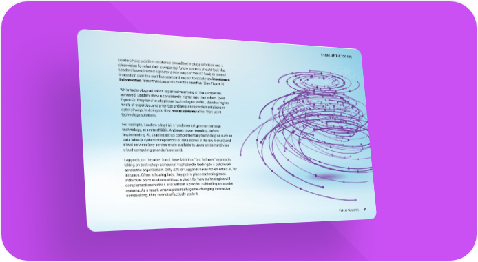 THINK LIKE THE TOP 10% Leaders have a deliberate stance toward technology adoption and a clear vision for what their companies’ future systems should look like. Leaders have directed a greater percentage of their IT budget toward innovation over the past five years and expect to accelerate investment in innovation faster than Laggards over the next five. (See Figure 3) While technology adoption is pervasive among all the companies surveyed, Leaders show a consistently higher rate than others. (See Figure 7) They tend to adopt new technologies earlier, develop higher levels of expertise, and prioritize and sequence implementations in optimal ways. In doing so, they create systems rather than point technology solutions. For example, Leaders adopt AI, a fundamental general-purpose technology, at a rate of 98%. And even more revealing, before implementing AI, Leaders set up complementary technologies such as data lakes (a system or repository of data stored in its raw format) and cloud services (any service made available to users on demand via a cloud computing provider’s servers). Laggards, on the other hand, have faith in a “fast follower” approach, taking on technology somewhat haphazardly leading to a patchwork across the organization. Only 42% of Laggards have implemented AI, for instance. Often following fads, they put in place technologies as individual point solutions without a vision for how technologies will complement each other, and without a plan for cultivating enterprise systems. As a result, when a potentially game-changing innovation comes along, they cannot effectively scale it. Future Systems 11