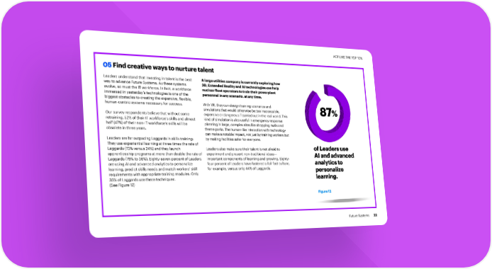 ACT LIKE THE TOP 10% 05 Find creative ways to nurture talent Leaders understand that investing in talent is the best A large utilities company is currently exploring how way to advance Future Systems. As these systems 3D, Extended Reality and AI technologies can help evolve, so must the IT workforce. In fact, a workforce nuclear fleet operators to train their powerplant immersed in yesterday’s technologies is one of the personnel in any scenario, at any time. biggest obstacles to creating the expansive, flexible, human-centric systems necessary for success. With VR, they can design training scenarios and simulations that would otherwise be too inaccessible, 87% Our survey respondents believe that without some expensive or dangerous if carried out in the real world. This 90% retraining, 52% of their IT workforce’s skills and almost kind of simulation is also useful in emergency response half (47%) of their non-IT workforce’s skills will be planning in large, complex sites like shopping malls and obsolete in three years. theme parks. The human-like interaction with technology can make a notable impact, not just by training workers but Leaders are far outpacing Laggards in skills training: by making facilities safer for everyone. They use experiential learning at three times the rate of Laggards (73% versus 24%) and they launch Leaders also make sure their talent is not afraid to of Leaders use apprenticeship programs at more than double the rate of experiment and present non-traditional ideas— AI and advanced Laggards (79% to 36%). Eighty-seven percent of Leaders important components of learning and growing. Eighty- are using AI and advanced analytics to personalize four percent of Leaders have fostered a fail-fast culture, analytics to learning, predict skills needs and match workers’ skill for example, versus only 44% of Laggards. personalize requirements with appropriate training modules. Only 35% of Laggards use these techniques. learning. (See Figure 12) Figure 12 Future Systems 22
